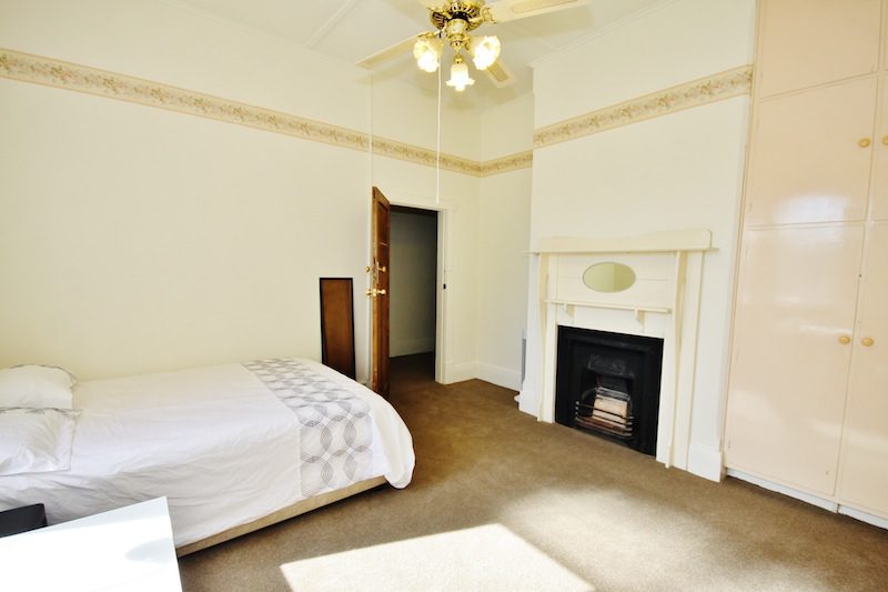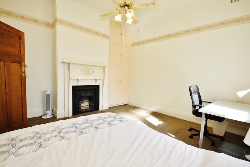 There’s plenty of room to move in this light-filled room with period fireplace, ornate ceiling fan, carpet, floor-to-ceiling built-in wardrobe and storage, and double picture window. Also included is a queen bed, bedside drawers and reading lamp, floor mirror, study desk with office chair and desk lamp.
