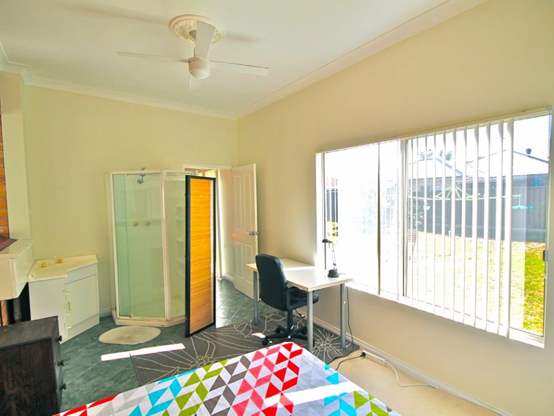 Private shower and basin!! This sun lit medium sized room has a private shower and basin, a queen bed, wardrobe, chest of drawers, ceiling fan, heater, study desk and chair. The room looks out across the back garden and is divided with an attractive coromandel screen to create an en-suite style set up.
