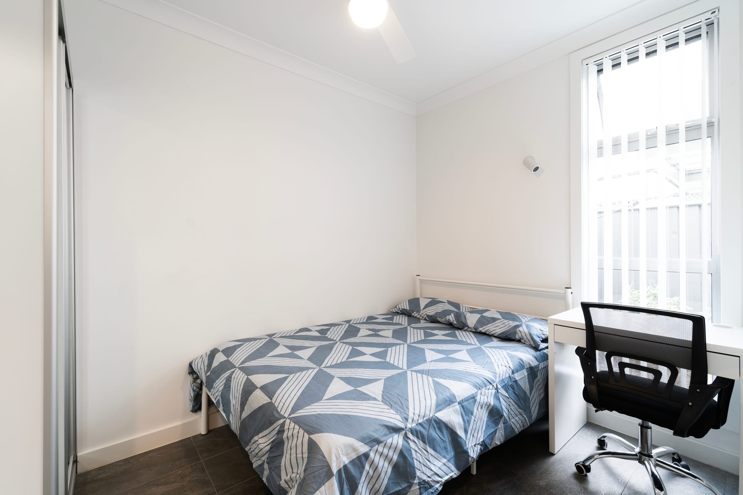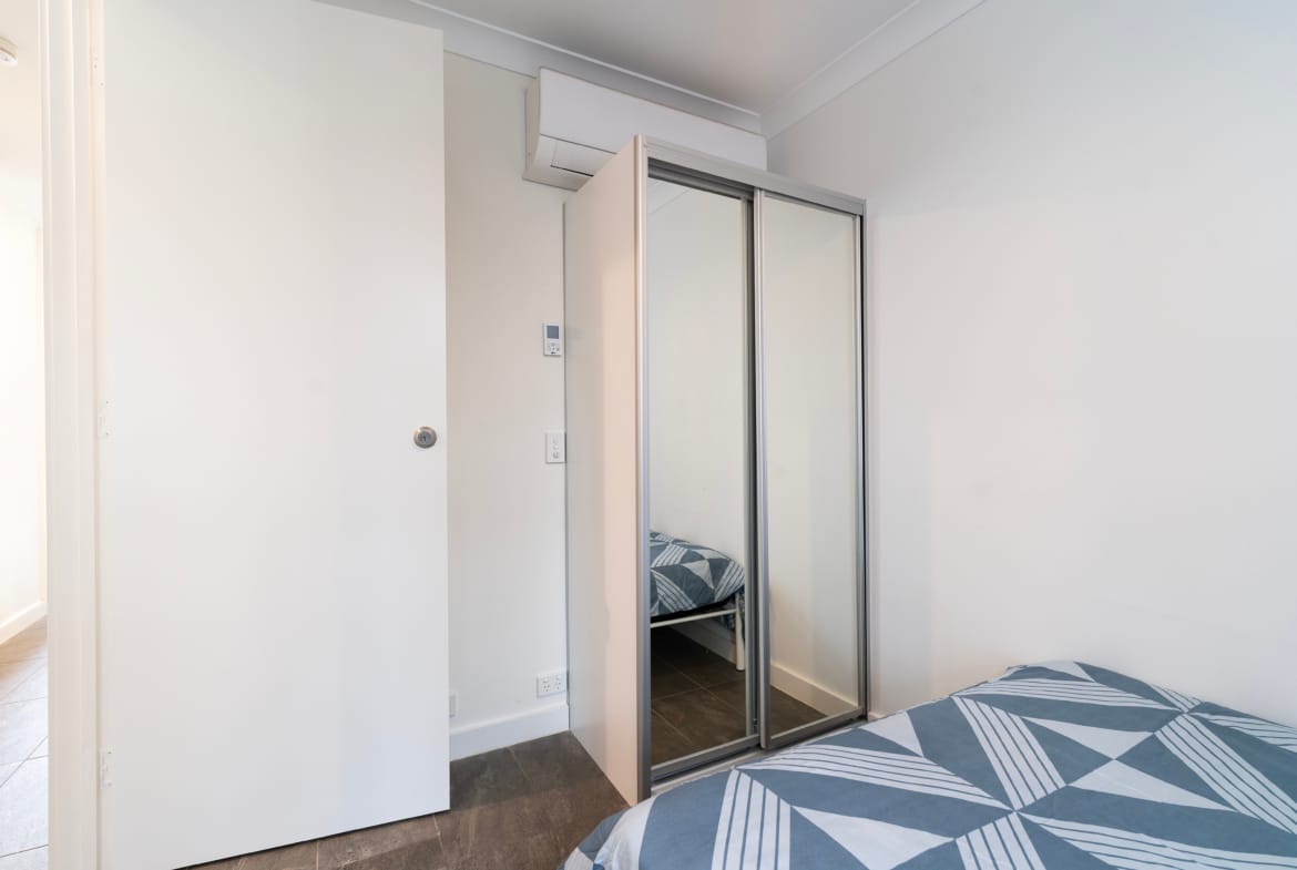 Quiet, bright, spacious – this room has it all. Lots of light, plenty of room and storage space, tile floors and individual reverse cycle split system air-conditioning pumped directly to your room, makes for perfect comfort all year round. located on the ground floor of the house, you’ll have the quickest access to the living area, downstairs bathroom and kitchen giving you privacy and quiet time for study, relaxation or sleep. Complete with double sized bed, desk, chair and built in robe.